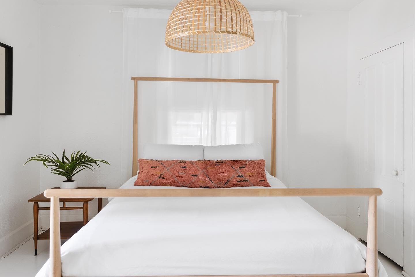 Couple before and after’s of one of my latest @airbnb makeovers. The wood poster bed from @ikeausa is one of my all-time favorites. I have it at three of the B&Bs I manage and also have one for my downstairs guestroom. Think I can put it together with my eyes closed now. Per usual I always try to find ways to make a space have a “wow factor” but on a budget. The back bedroom had a wall that was begging for something fun. I grabbed some paint from my garage and just did a little mural of some shapes that were not supposed to be too perfect. The wall was very textured so I couldn’t use tape and had to just wing it. When designing Airbnb‘s I’d like to incorporate design elements that people usually wouldn’t try in their own homes. I want guests to feel like they’re at a fun boutique hotel and maybe be inspired to try something a little out of the box in their own home. After all, we all need to add a little more fun into our lives...especially these days. 🖤#airbnb #airbnbdesign #interiordesign #bohostyle #ikea #mural photo @stephaniekayfilms
